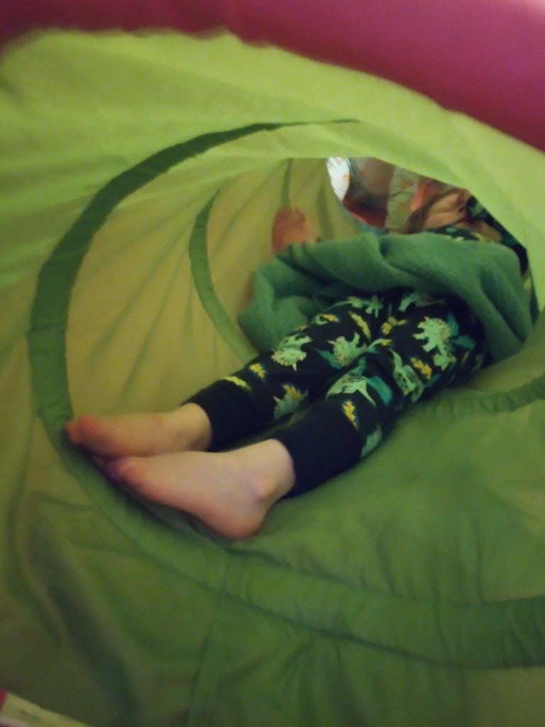 At bedtime tonight two of my boys started playing with their bright green IKEA tunnel, climbing into it to lie down and pretend to sleep, as though it were a cocoon. Watching them I caught myself thinking, “Yes! That’s what I’d like to do. I’d like to build myself a cocoon and lie in it, until -” But until what, I’m not so sure.