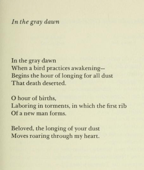 I’ve wanted for a long time to write a series of reflections on the poetry of Holocaust survivor and Nobel laureate Nelly Sachs. That will have to wait for another time, but this week’s poem comes from a sequence of hers called “In the Habitations of Death”, where imagery of death, dust, longing and encountering God coalesce. Sachs battled the long-term effects of trauma for much of her life and did not to my knowledge find the fulfillment of God’s promises in Jesus. But there’s much power and vividness in how she describes the meeting point between human helplessness and the work of God. This particular poem, with its allusions to God digging into the dust to make Adam and then digging into Adam to make Eve, is especially evocative for me.